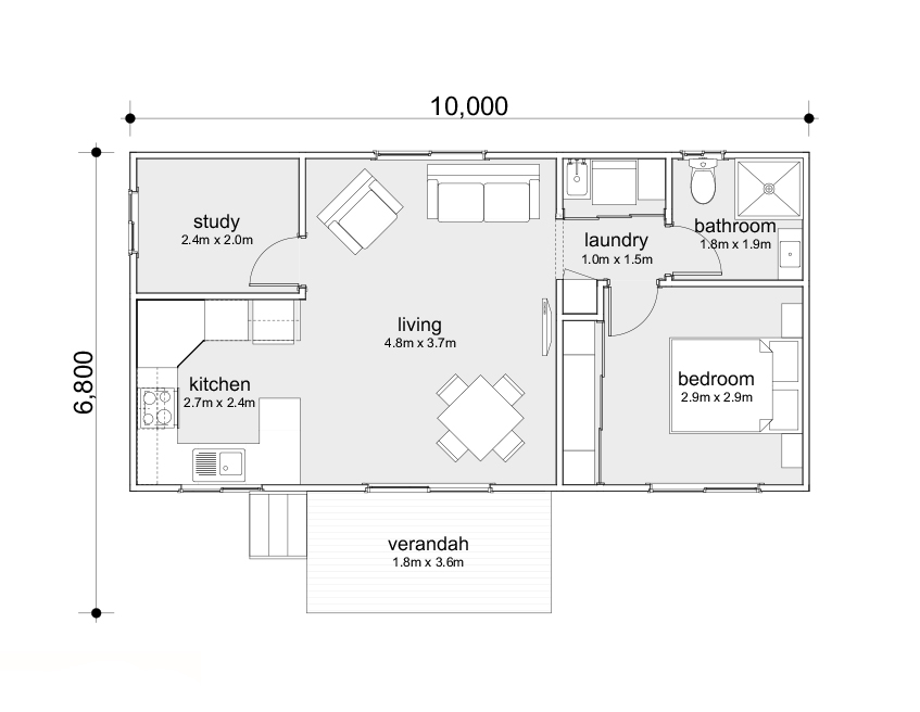 Perfect for long stays for couples or small families, this cabin offers a generous queen-size bedroom, a large ensuite and a built-in laundry area. There’s room to spread out with an open living and dining area, a full-size kitchen and a study that can be transformed into a second room. Prices subject to change based on material cost fluctuations.