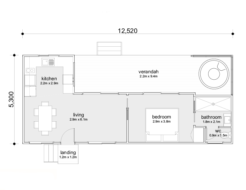 This luxurious cabin is perfect for longer stays and provides an elegant backdrop for a couples’ holiday. The cabin includes a large kitchen area with cooking facilities, a grand bedroom and a spacious ensuite. The bedroom opens to a private verandah that can house a spa or other outdoor attractions. Prices subject to change based on material cost fluctuations.