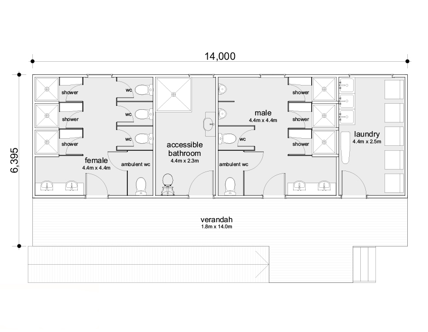 This large toilet block offers three male and three female showers, toilets and facilities, and an accessible bathroom and shower. Designed to incorporate a generous laundry, it is made for large commercial businesses. Prices subject to change based on material cost fluctuations.