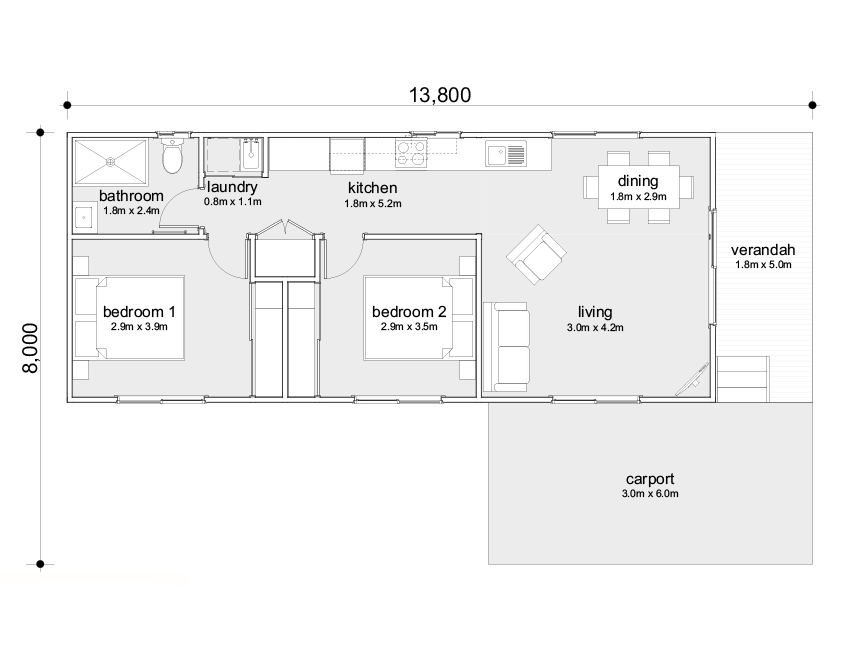 Our best-selling two-bedroom home is perfect for those wanting comfortable living. This comfortable dwelling boasts a full suite of cooking appliances, a bathroom and two bedrooms with built-in robes. A large front verandah is perfect for entertaining outdoors, and a single carport provides additional convenience. Prices subject to change based on material cost fluctuations.