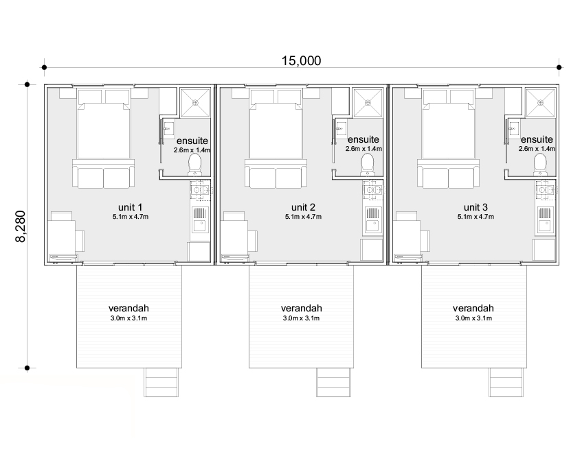 These three spacious studio rooms offer queen-sized bedrooms, adjoining living, a kitchenette with cooking facilities, a bathroom, and private front verandahs. Prices subject to change based on material cost fluctuations.