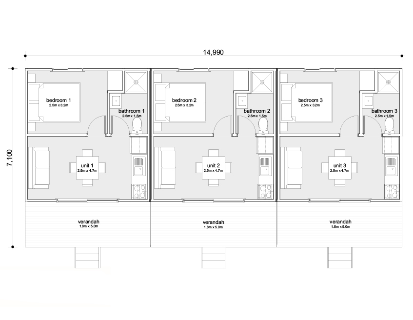 The generous layout makes this accommodation perfect for a more extended stay. It features three spacious one-bedroom rooms, a large living area with a kitchen, a separate bedroom and bathroom and private front verandahs. Prices subject to change based on material cost fluctuations.