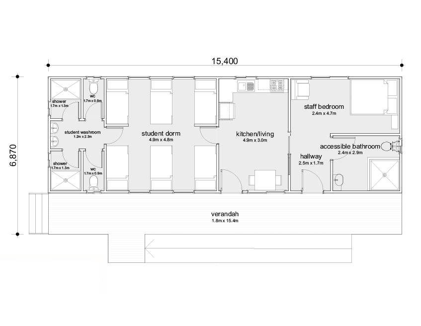 This spacious accommodation can sleep up to 14 people, with a large student dorm room, three bathrooms, communal dining and living areas. There’s also a staff bedroom with internal and external access and a large front verandah. As with many of our cabins, we offer a range of accessibility options. Prices subject to change based on material cost fluctuations.
