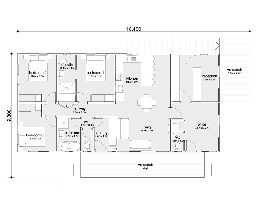 With a spacious reception and secondary kitchenette, this floorplan provides a private three-bedroom home for your managers and space for workers and clients. The building boasts a private verandah, a laundry, a bathroom and large kitchen facilities for your onsite needs. Prices subject to change based on material cost fluctuations.