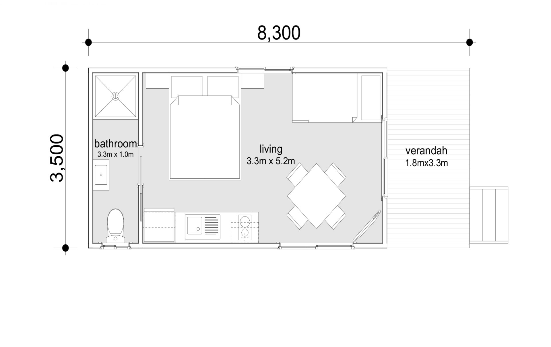 This simple studio cabin sleeps up to four people and includes a kitchenette with cooking facilities, a compact bathroom, and a front verandah. Perfect for overnight visitors or workers.