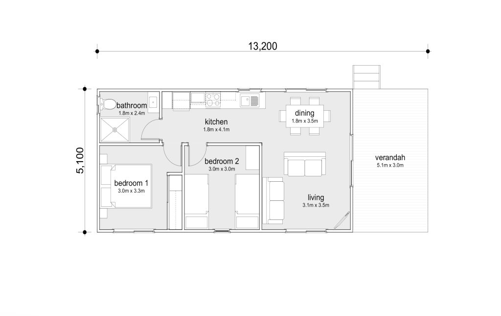 Our best-selling two-bedroom cabin sleeps up to eight people. It is perfect for families wanting a comfortable holiday, with cooking facilities, a bathroom, a bedroom with a built-in robe and a second room with shelving space. Also included is a large front verandah for outdoor gatherings.