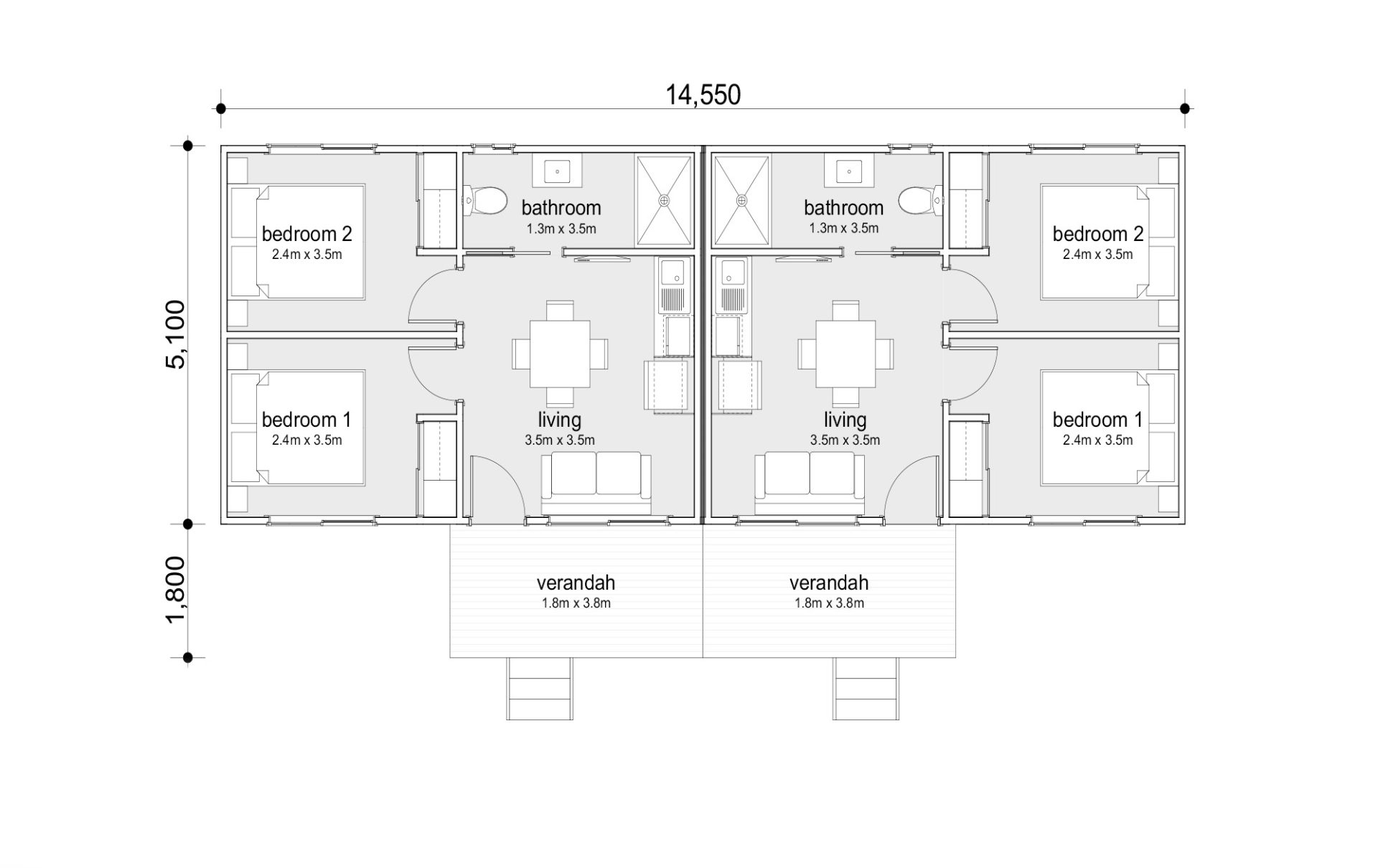 Designed for narrow sites, this duplex has two queen-sized bedrooms with built-in robes, a compact kitchenette and ample bathroom space. Made for families, couples or worker accommodation, the duplex sleeps up to eight people.