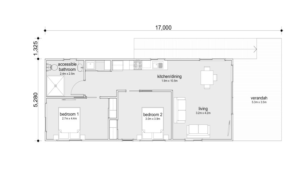Designed for accessibility, this cabin offers two spacious, accessible-friendly bedrooms with a shared bathroom, laundry and kitchenette. The cabin can be configured to sleep up to six people.