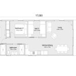 This cabin is space-conscious and made for tight site requirements while boasting three bedrooms, one bathroom, a kitchenette, an ensuite, spacious living and dining, and a large front verandah.
